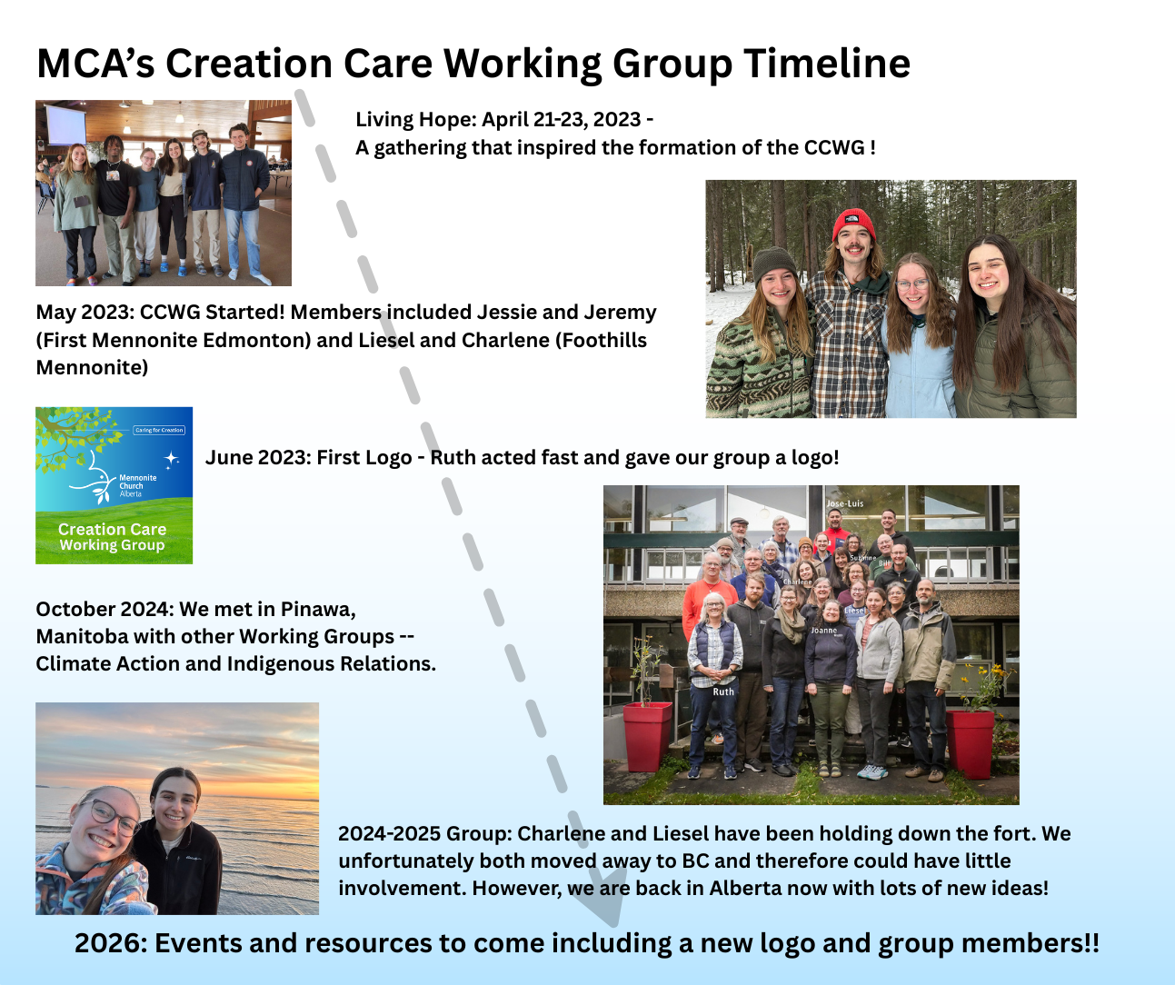 We both had the opportunity to attend the Living Hope Climate Conference in Manitoba back in April 2023. After learning that all the other provinces had creation care working groups, it sparked our own desire to create one here in Alberta. Working alongside other Alberta representatives from the conference Jeremy Wiens, and Jessie Brandt, from First Edmonton, we were able to start creating conversations around creation care and climate action in Alberta. Tim Wiebe-Neufeld of MCA and Sandy Plett of MC Canada helped facilitate our discussions and make connections to build conversation and connect with other individuals. We hope to continue this narrative and work alongside MCA to strengthen relationships.
