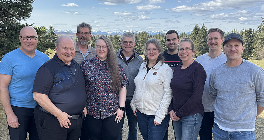 Pastor's Retreat in Cochrane, Spring 2025. L - R: Bill Christieson, Tim Burkholder, Tim Wiebe-Neufeld, Debbie Bledsoe, Terry Fach, Rachel Siemens, Aiden Scherzinger, Tany Warkentin, Caleb Kowalko, Ryan Dueck